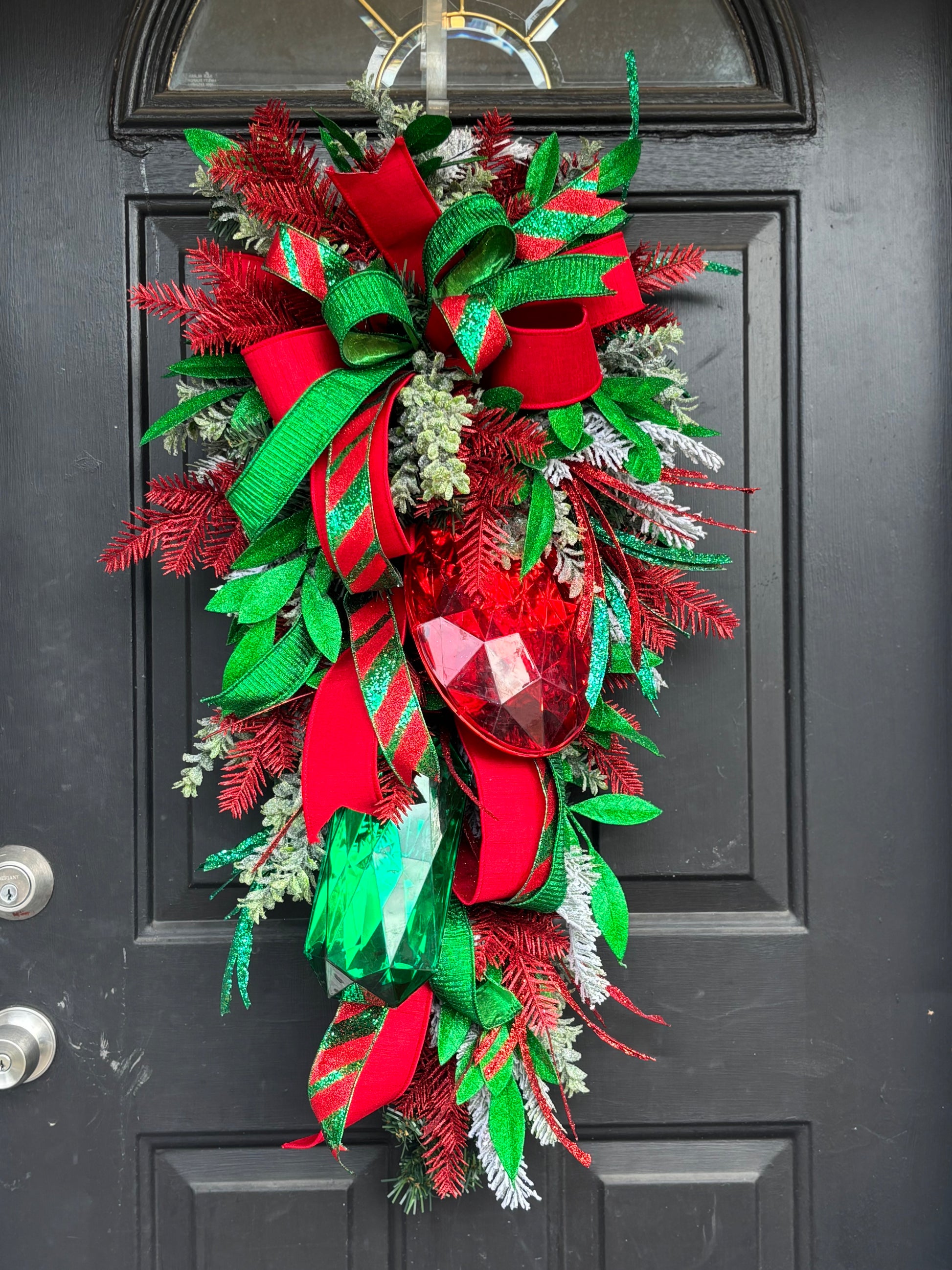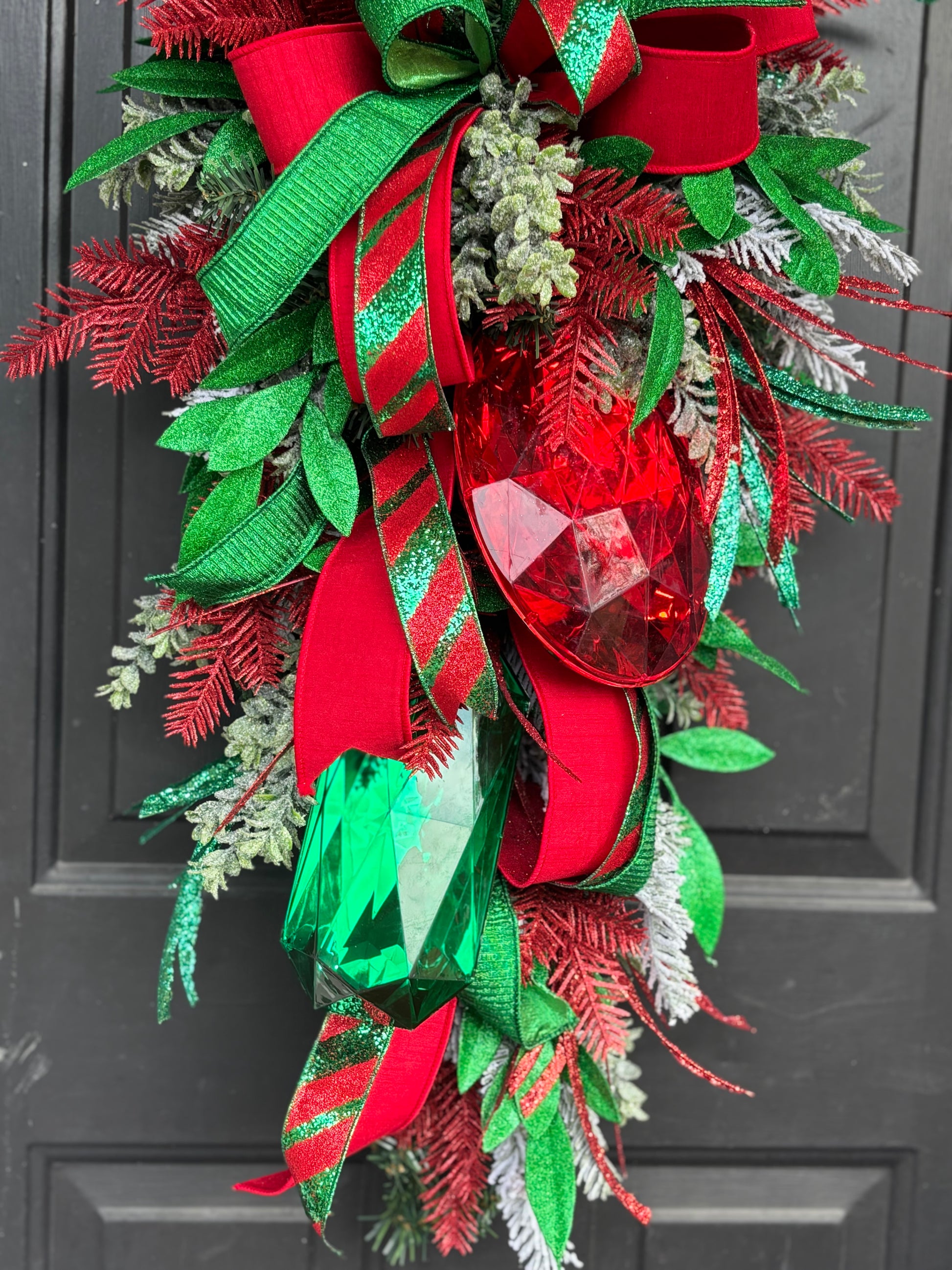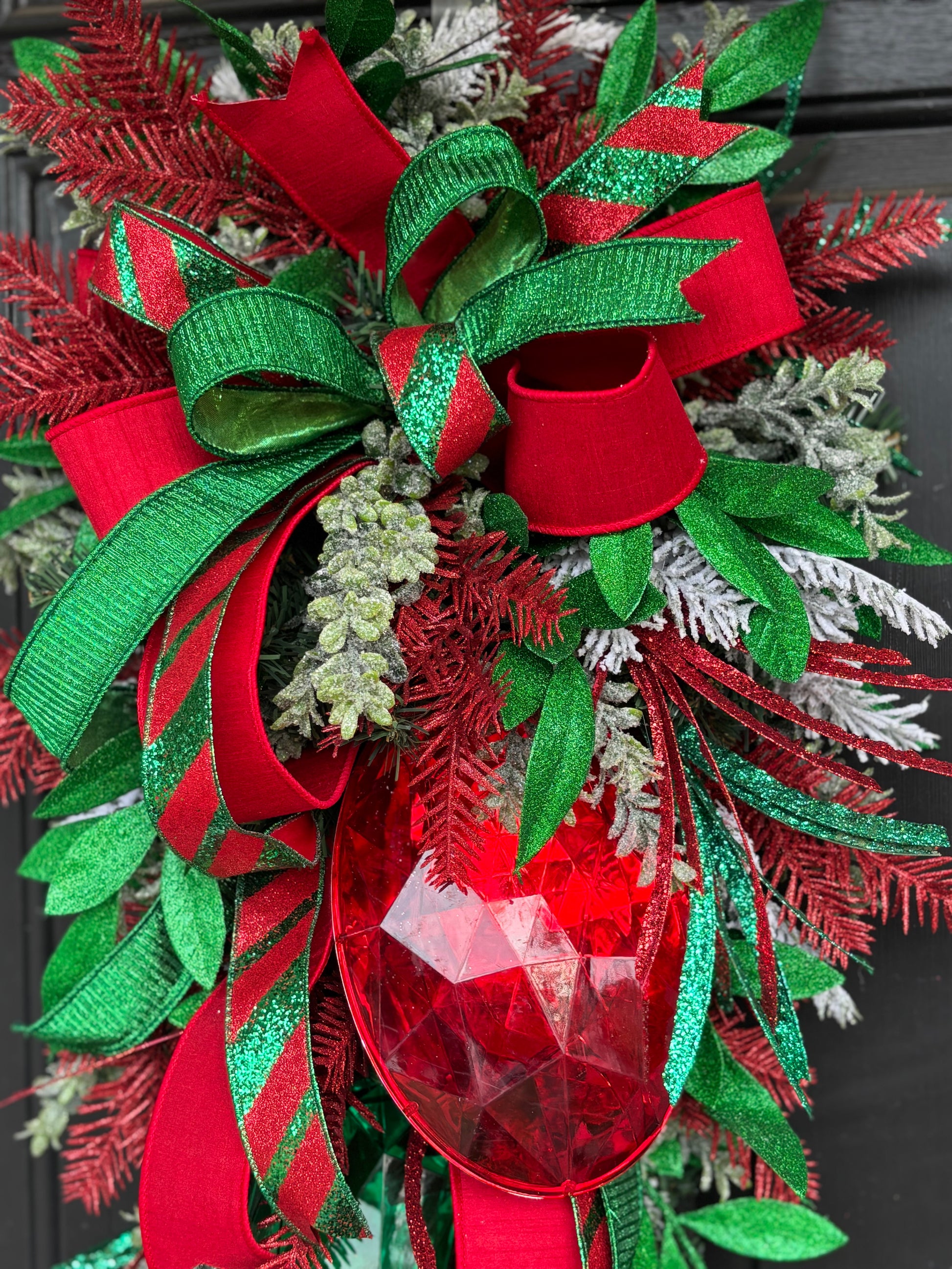 Capture the magic of a snowy Christmas morning with the Frosted Holiday Jewel Swag. This handcrafted design combines the bold beauty of rich red and emerald ribbons with shimmering gemstone ornaments, balanced by soft frosted greenery and pine accents. The result is a piece that feels both festive and timeless—like winter wonderland luxury right at your front door.
