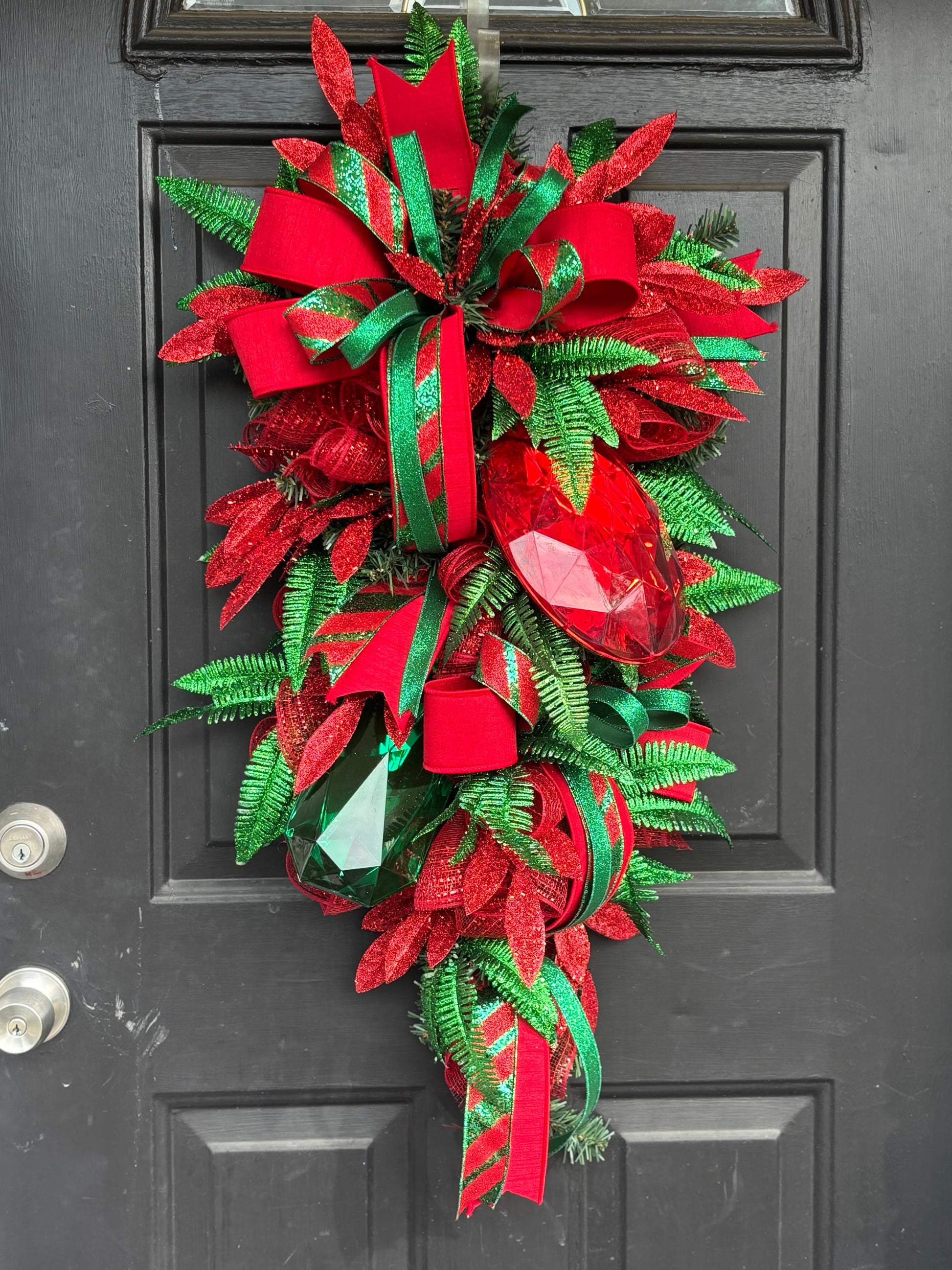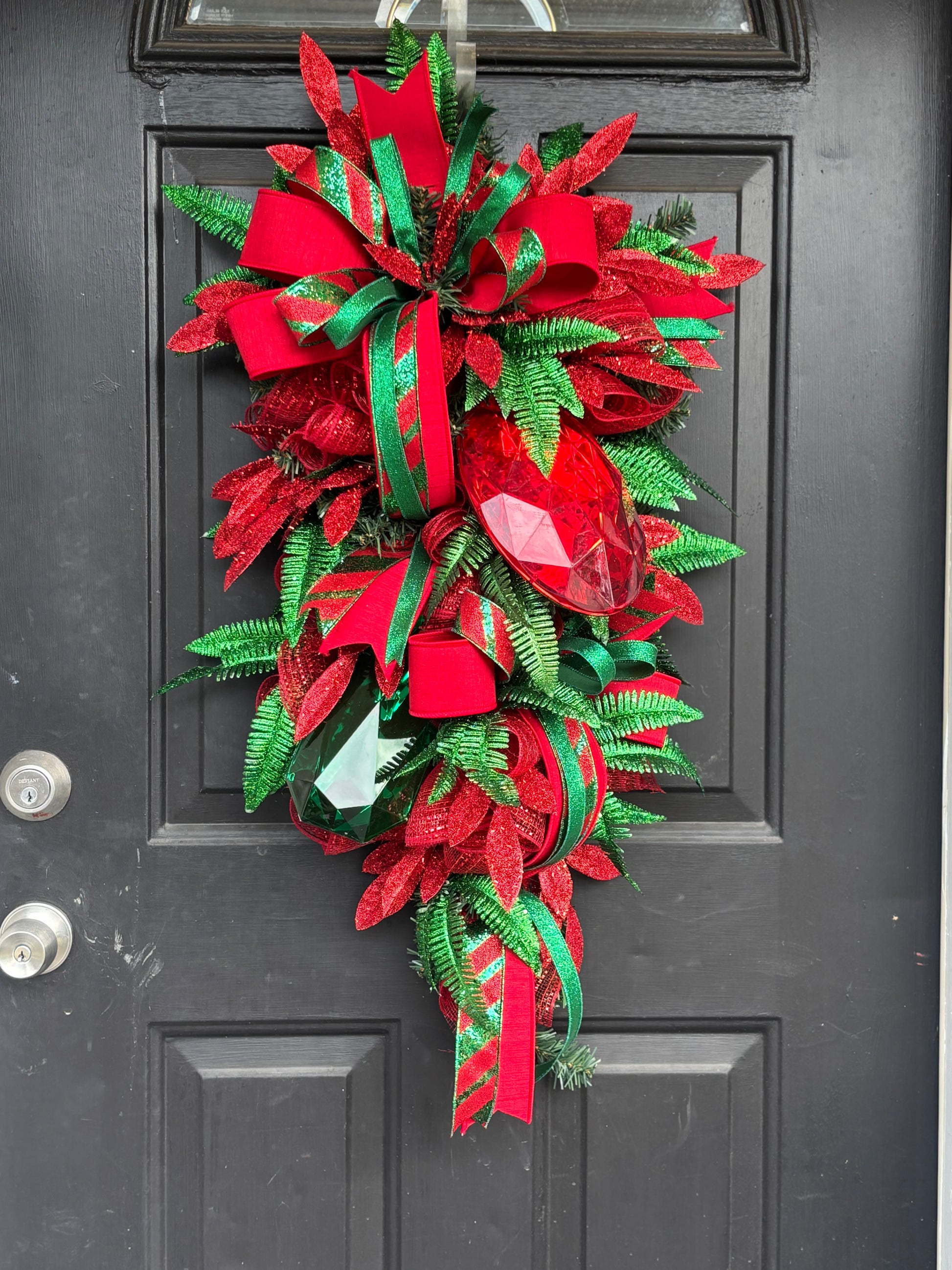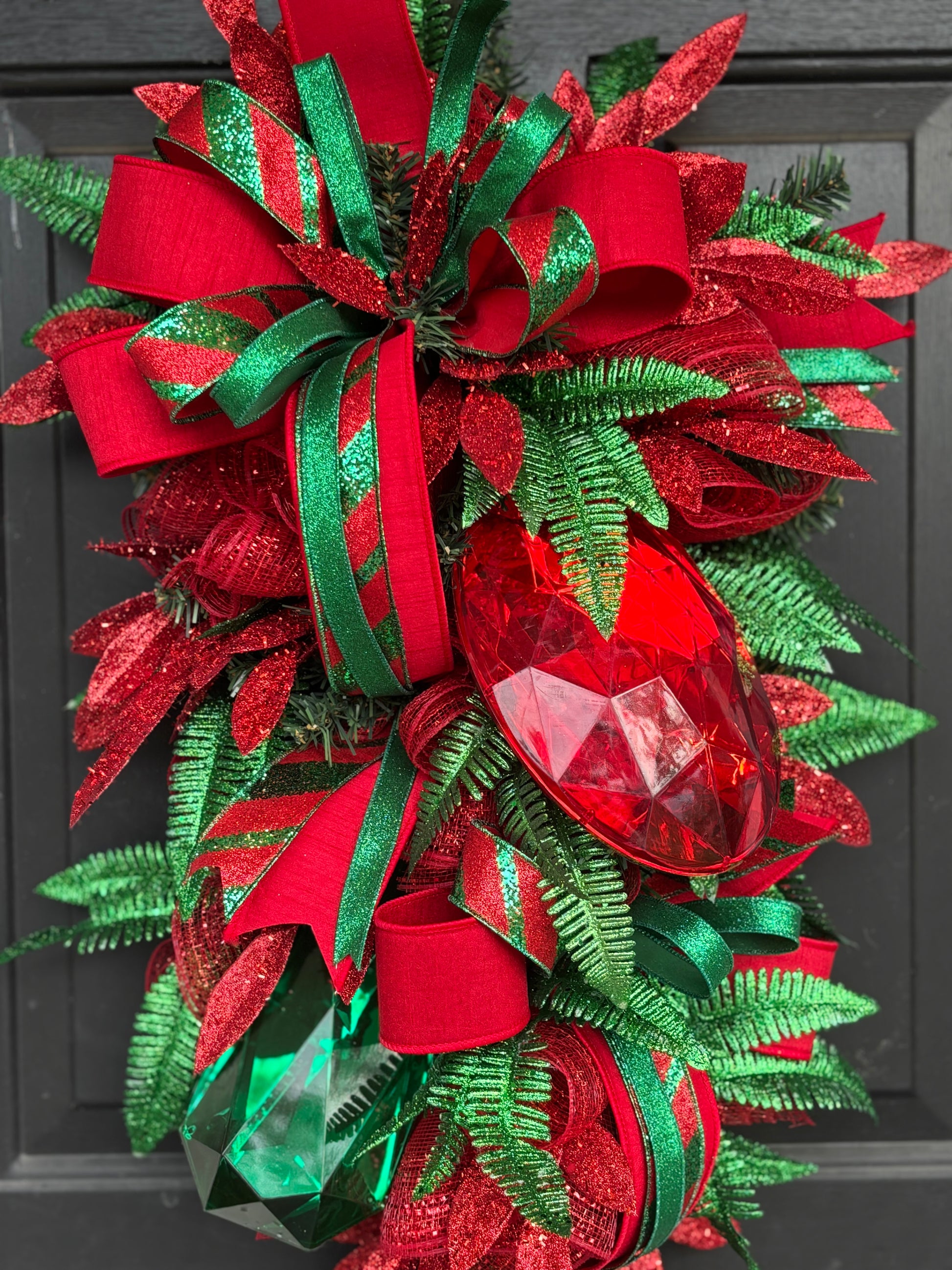 Bring timeless elegance to your front door this holiday season with The Enchanted Holiday Jewel Swag. Handcrafted with lush glitter greenery and sparkling gemstone ornaments, this design captures the magic of Christmas in every detail. The bold red and classic green ribbons are perfectly layered to create a rich, luxurious look that makes a statement before guests even step inside.