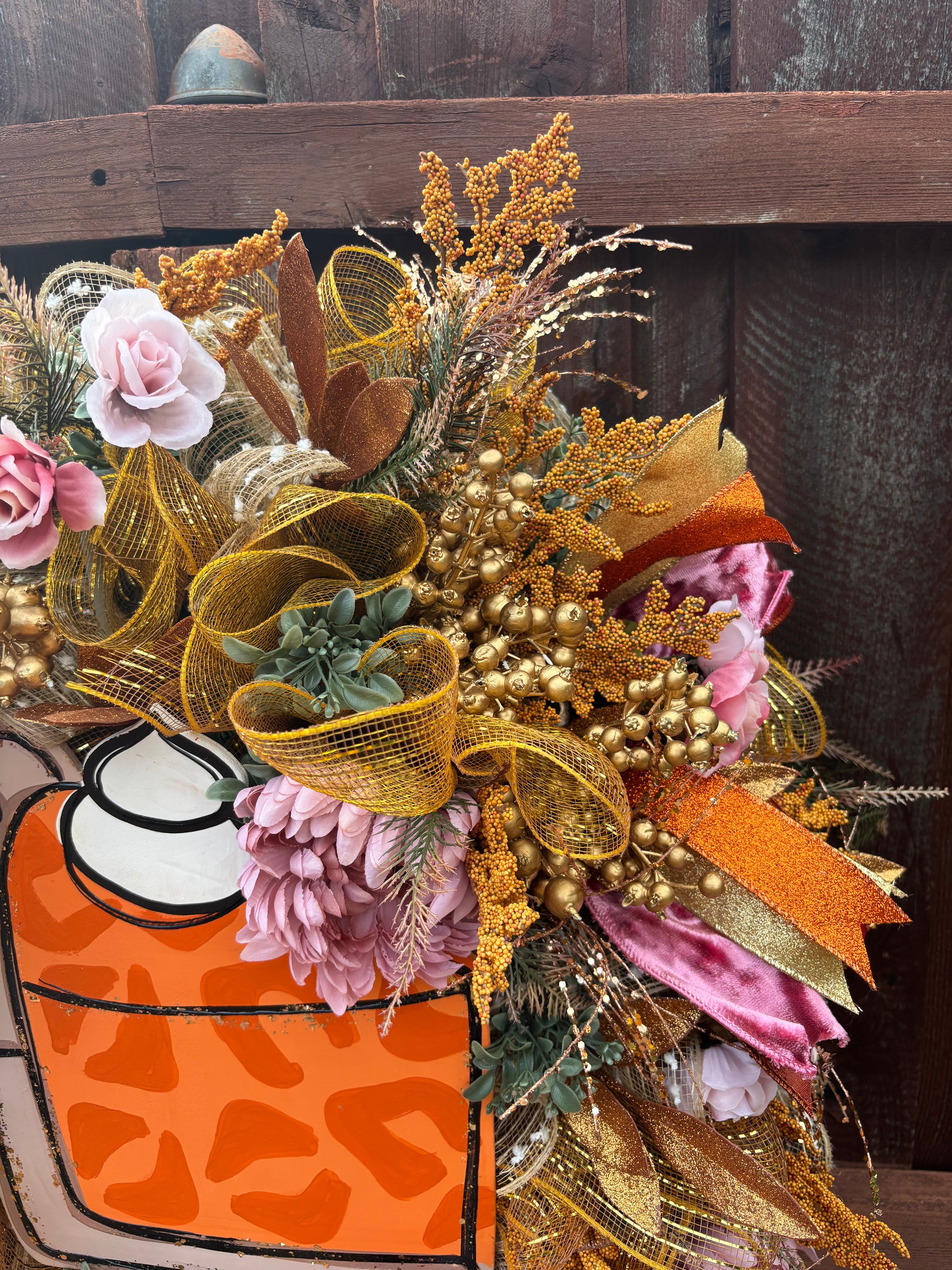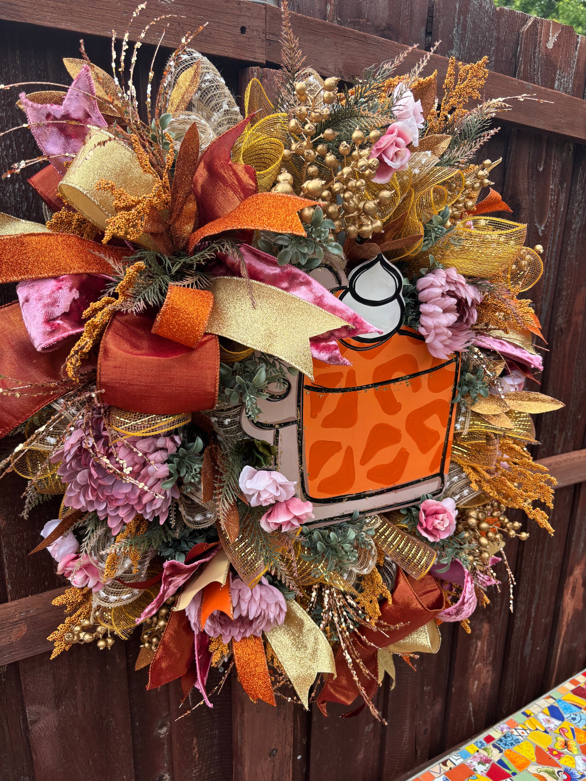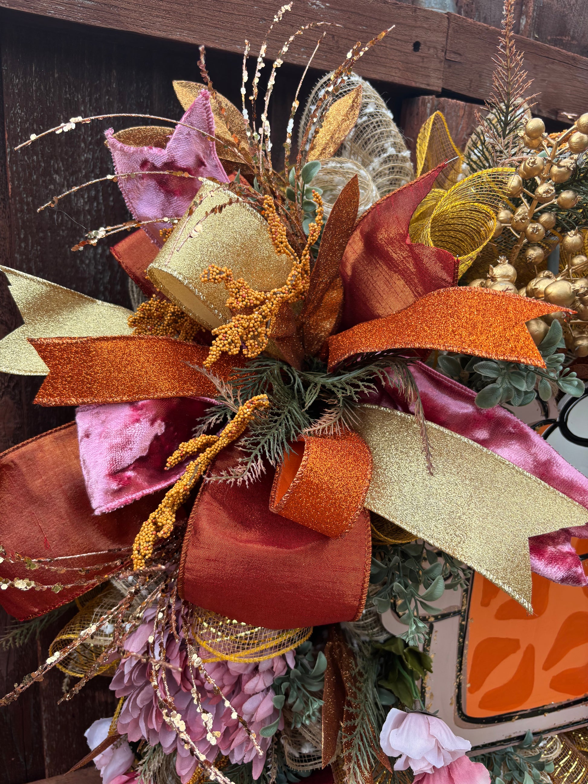 Wrapped in layers of glam—think velvet ribbons in blush and burnt orange, sparkling golden berries, shimmering mesh, and luxe florals—this wreath brings the drama in all the best ways. It's giving pumpkin spice runway. It's giving "my front door just became the chicest spot on the block."